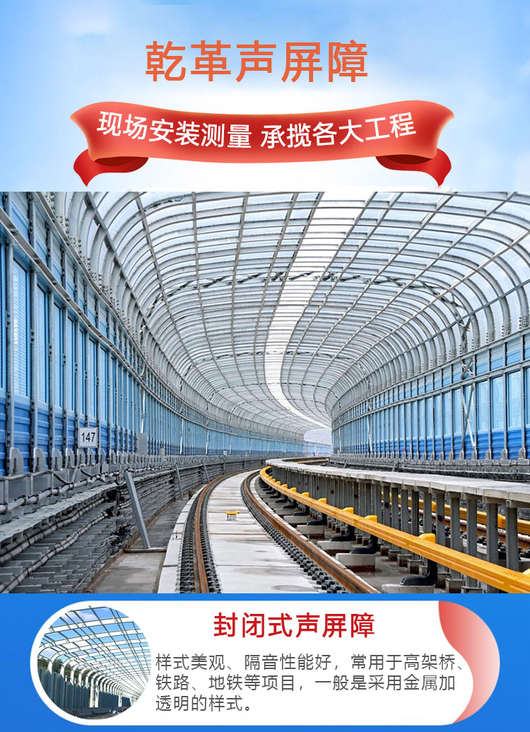 全封閉聲屏障的優勢有降噪、生態保護、承受風荷、質量高4種,,廣泛用于鐵路、高架路、學校、醫院等領域。